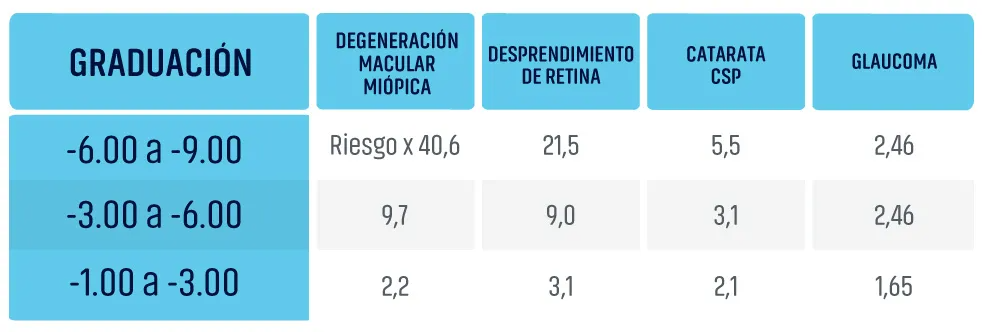 Cualquier nivel de miopía aumenta los riesgos de las patologías oculares, el incremento se vuelve exponencial una vez que se alcanza la alta miopía.